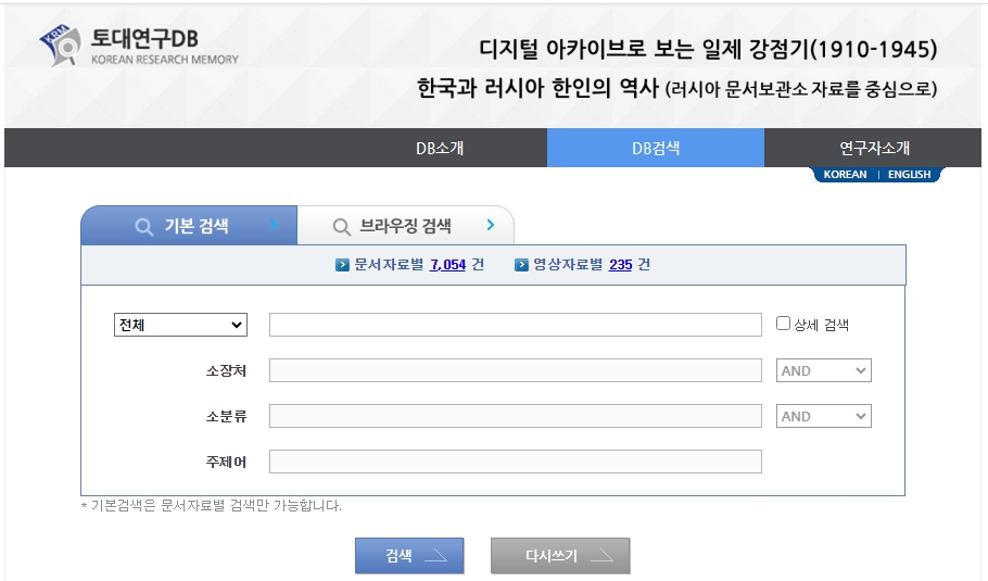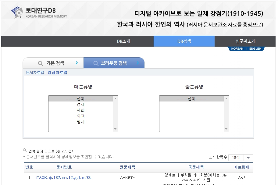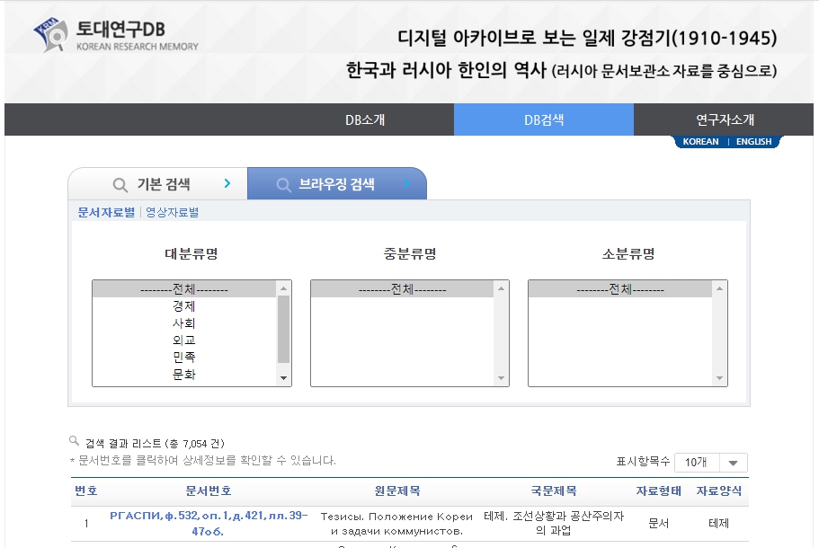 일제강점기(1910-1945) 동안 한국과 러시아(소련) 그리고 일본은 전쟁, 혁명, 식민지배, 항일운동 등으로 인해 격동의 시간을 공유했다. 당시 일본제국주의 정부의 사회경제적 수탈, 그리고 한민족 말살 시도에 저항해 우리 선조들은 한반도를 넘어 극동러시아 지역에서 활발한 항일운동을 펼쳤으며, 이 시기 러시아(소련)에서 발생한 다양한 역사적 사건에 때로는 적극적 행위자로, 때로는 소극적 참여자 및 피해자로 연루되었다. 극동러시아 한인들은 1917년 러시아혁명 운동에 참가했고, 1920년대에는 항일무장활동에 참여하기도 했다. 1930년대에는 농민으로, 산업노동자로 농업집단화, 산업화에 참여했고 30년대 중후반에는 스탈린 대숙청의 희생자가 되었고 중앙아시아로의 강제이주 대상자가 되기도 했다. 제2차 세계대전 동안 소련 한인들은 노동자로 그리고 드물게는 군인으로서 전후방에서 소련 시민의 의무를 수행했다. 이 시기 소련은 한반도를 식민화하고 극동지역으로 지배영역 확장을 노리고 있던 일본을 예의 주시하였고 그 과정에서 소련 정부, 군사, 사회 기관 등은 한인 및 한반도와 관련된 많은 정보를 수집하고 기록을 남기고 관련 정보를 보관해왔다. 비록 소련이 해체되고 문서보관소가 일반인들에게 공개되기 시작한 1990년대 초 이래 많은 한국 연구자들이 러시아문서보관소 자료를 입수해왔지만 자료의 체계적 정리가 되어 있지 않아 자료 활용에 많은 문제점을 지니고 있었다. 이러한 문제를 개선하기 위해 본 연구단은 러시아문서보관소 자료의 데이터베이스(DB)화를 수행했다.