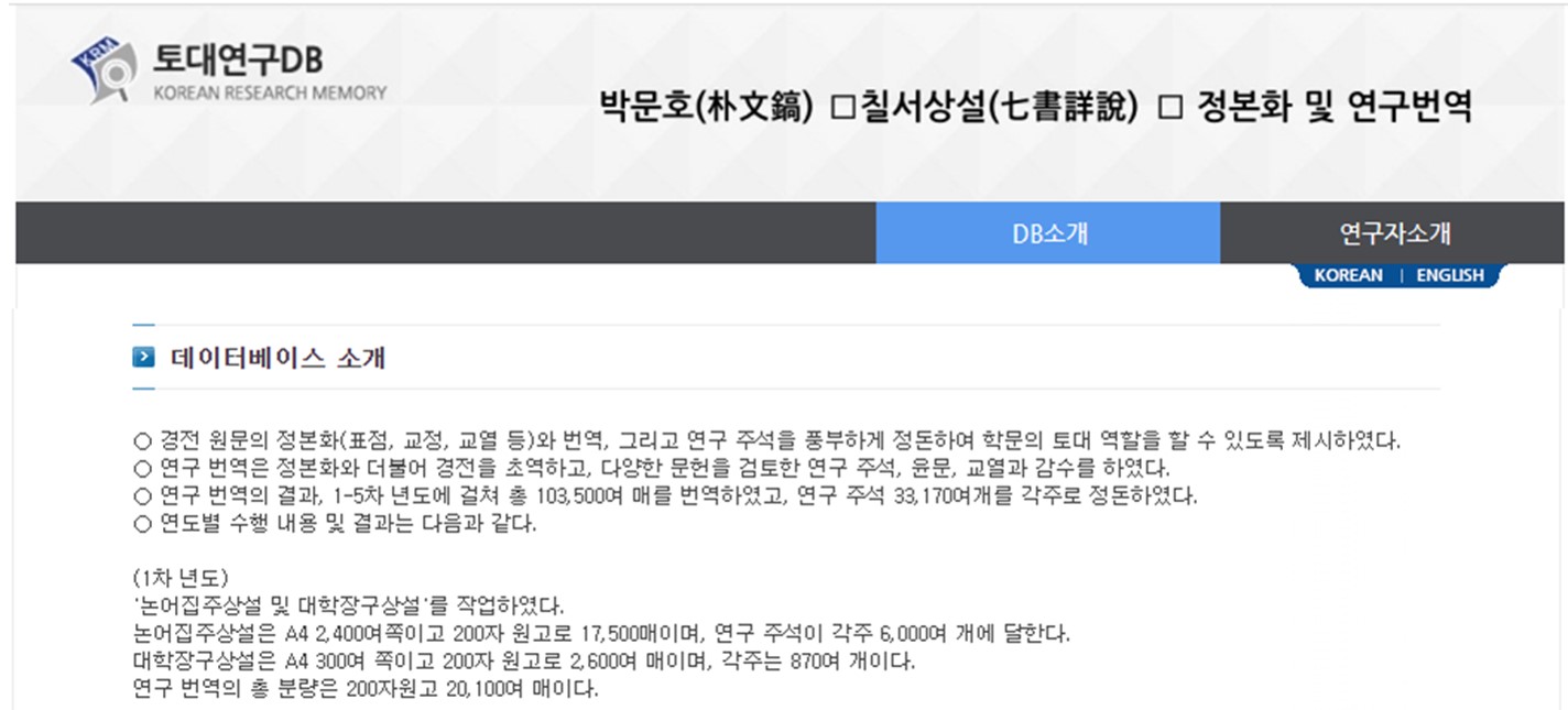 ○ 경전 원문의 정본화(표점, 교정, 교열 등)와 번역, 그리고 연구 주석을 풍부하게 정돈하여 학문의 토대 역할을 할 수 있도록 제시하였다. ○ 연구 번역은 정본화와 더불어 경전을 초역하고, 다양한 문헌을 검토한 연구 주석, 윤문, 교열과 감수를 하였다. ○ 연구 번역의 결과, 1-5차 년도에 걸쳐 총 103,500여 매를 번역하였고, 연구 주석 33,170여개를 각주로 정돈하였다. ○ 연도별 수행 내용 및 결과는 다음과 같다. (1차 년도) '논어집주상설 및 대학장구상설'를 작업하였다. 논어집주상설은 A4 2,400여쪽이고 200자 원고로 17,500매이며, 연구 주석이 각주 6,000여 개에 달한다. 대학장구상설은 A4 300여 쪽이고 200자 원고로 2,600여 매이며, 각주는 870여 개이다. 연구 번역의 총 분량은 200자원고 20,100여 매이다. (2차 년도) '맹자집주상설 및 중용장구상설'를 작업하였다. 맹자집주상설은 A4 2,500여쪽이고 200자 원고로 18,000매이며, 연구 주석이 각주 4,500여개에 달한다. 중용장구상설은 A4390여 쪽이고 200자 원고로 3,000여 매이며, 각주는 1000여 개이다. 총 분량은 200자 원고 21,000여 매이다. (3차 년도) '시집전상설' 를 작업하였다.시집전상설은 A4 2,900여 쪽이고 200자 원고로 2,0200여 매이며, 연구 주석이 각주 8,700여 개이다. 총 분량은 200자 원고 20,200여 매이다. (4차 년도) '시서변설상설 및주역본의상설' 를 작업하였다.시서변설상설은 A4 300여 쪽이고 200자 원고로 1,800여 매이며, 연구 주석이 각주 400여 개이다.주역본의상설은 A4 2,300여 쪽이고 200자 원고로 20,300여 매이며, 연구 주석이 각주 6,500여 개이다. 총 분량은 200자 원고 22,100여 매이다. (5차 년도) '서집전상설'를 작업하였다. 서집전상설은 A4 2,600여 쪽이고 200자 원고로 20,300여 매이며, 연구 주석이 각주 5,200여 개이다. 총 분량은 200자 원고 20,300여 매이다.