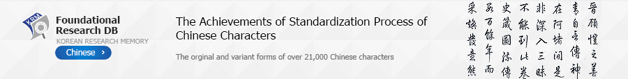 A major research target of humanities is literature. This study intends to look into the present and to envision the future through literature by studying ancestral spirits that are prevalent in traditional cultural legacies. Traditional cultural legacies were mostly recorded in Chinese characters. The meaning of each letter in the official forms and variant forms of Chinese charactersis the completely same when reading, but they different from each other in the letter type. Most of the texts were recorded not in official forms but in variant forms that it is difficult to discern their identities at first glance. Besides, a majority of the variant forms were tinted with a contemporary trend, which makes it more difficult to access the data.For example, in “Newly Revised Tripitaka (新修大藏經)” into which the Tripitaka was transcribed in official forms, the letter of“*” in ”或商賈博” was transcribed into the letter of “貨.” The letter type of the left and right strokes on the top of this letter is similar to “*,”which is the variant form of “卯,” and the letter type of “*” is in the variant form of “留.” In the above sentence, “商賈” is the subject, and “博” is the predicate. If the letter of “*” is seen as the letter of “貨,” it is difficult to understand this sentence. This letter is not the letter of “貨” but the letter of “貿.” Only an error in one letter can devaluate the whole Japanese Tripitaka and can lead to a wrong succession for a spiritual culture. Thus, even if an error is limited to one letter, it should not be lightly treated. In conclusion, it is more than necessary to study variant forms for an accurate interpretation and transmission of literature. The data collected and stored for three years from 2002 to 2005 under the auspices of the National Research Foundation of Korea (formerly Korea Research Foundation) is about the real variant formsthat have not been studied before. This data contains a total of 5,000 letters in official and variant forms found on the epitaphs that span from the Eastern Han Dynasty era to the Song Dynasty era of China, including those found on the epitaphs that span from the Three Kingdoms era to the early Goryo Dynasty era. This data is about the letters in official and variant forms, which are directly gathered from about 2,000 kinds of epitaphs in China and Korea. This contains the contents covering a total of 2,700 pages that span from the Eastern Han Dynasty era, the Wei Jin Nan Bei Dynasties era, the Sui and Tang Dynasty era, and to the Song Dynasty era of Chinaas well asfrom the Three Kingdoms era, the unified Shilla era, and the toGoryo Dynasty era of Korea. In order to efficiently store, maintain, and utilize these studies, this research constructed a DB and a system in line with the outcomes of the “Construction of Chinese Character Standardization Theory” under the auspices of the National Research Foundation of Korea for six months from December 2011 to June 2012.Through the intuitive navigation and web searching machine, the prompt provision of information on various terminologies was made possible.