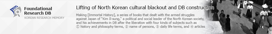 The purpose of this research is to increase the accessibility and applicability of the general researchers by reprocessing the results of and to provide its public service. The existing result of is an integrated databaseof a total of 32 volumes of “A Series of the History of Immortality (hereinafter called “Series”),”which dealt with the armed struggle against Japan of Kim Il-seong, the political and social leader of North Korea, and his achievements after the liberation, with four subjects, such as ① historical and political terms, ② names, ③ everyday words, and ④ articles by mutually connecting the original text with the annotation data in hypertexts. The existing tasks also published “Glossary of the Series ‘History of the Immortality’ (2009),” which summarized the “Series” by contents and items, “Deconstruction of the Series ‘History of the Immortality’” (2009), and “Reading the ‘History of the Immortality,’ the Cultural Canon in North Korea (2009).” The “Series,” which is the original book dealt with by this research, includes very massive contents included in a total of 32 volumes (more than about 91,000 manuscript papers), such as 17 volumes of “Anti-Japanese Revolutionary Struggles” and 15 volumes of “Postliberation Struggles.” The “Series” deals with the activities of about 30 independence organizations and student groups and about 200 historic events at home and abroad for about 70 years from around 1975 when Kim Il-seong started his armed struggle against Japan to 1994 when he died. As many as a minimum of 80 people to a maximum of 200 people appear in each of the book, and most of the heroes or significantpeople who appear in the books are still living. In addition, the spatial backgrounds of the books are wide areas, such as the northeastern part of China; South and North Manchuria; Joseon area around the base of Mt. Baekdu before the liberation; and North Korea, Japan, and Russia after the liberation, which proves that the “Series” is not limited to the biography of Kim Il-seong but is actual historical data that can analyze the dynamics between the surrounding East Asian countries for the past 60 years.
