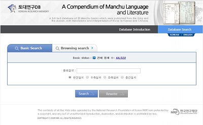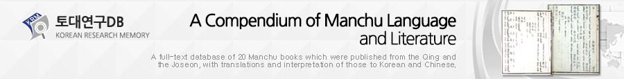 This work is the result of a project conducted for 3 years from September 1st, 2012, under the title “Building of Manchu Dictionary and Literature DB for Integral Study of Manchu Language and Literatures.” In the project, we input texts of 20 books selected from several Manchu dictionaries and Manchu literatures printed published in the Ching and the Joseon Dynasty.