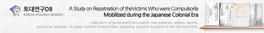 "Materials research on maritime accidents during the return of Korean forced labors and the return policy" which was supported by Korea Research Foundation from 2013 to 2015, is related to the maritime accidents while the Korean forced labors were returning home during the Japanese colonial period. The research team collected more than 10 thousand pages of data including 811 cases or 5,656 pages of Japanese data, 1,179 cases or 3,707 pages of GHQ documents and 366 cases of Korean documents.