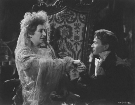 소설인 원형콘텐츠가 영화로 변용되며 영상 이미지로 하비샴이 구현된다. 1940-50년대 영국 영화를 대표하는 감독 데이비드 린이 연출한 영화에서 하비샴은 거칠게 상한 베일과 드레스를 입고 주로 앉아있는 모습으로 카리스마를 드러낸다. 주로 강렬한 여성 인물을 많이 연기해온 영국의 배우 마르티타 헌트가 위엄 있는 이미지의 하비샴을 완성한다. 하비샴을 영화적으로 드러내는 또 다른 요소는 의상과 그녀의 저택이다. 그녀가 입고 있는 웨딩드레스는 리넨과 레이스 소재로 영화가 흑백임에도 빛바랜 느낌이 전달되며 부서질 것 같으면서도 은은하게 반짝인다. 고풍스러운 가구와 촛불이 꽉 찬 저택은 공포를 자아내며, 그녀의 죽음 장면에도 자신이 평생 집착하던 결혼식 날의 웨딩드레스와 식탁보가 큰 역할을 한다. 고전적 이야기체 영화의 거장인 데이비드 린은 영국의 문학 전통을 중시하여 인간성과 겸손함이라는 고귀한 미덕을 지적으로 살려낸다. 현악기 구성이 두드러지는 오케스트라 음악은 영화의 상황과 인물의 감정을 뒷받침해주면서 효과적으로 드러내주는 장치이다. 소설의 길이를 다소 줄여서 각색한 작품은 그 해 아카데미 시상식에서 촬영상과 미술상을 수상하며 디킨스 작품을 가장 지적이고 훌륭하게 각색한 작품으로 평가받는다. \r\n관련자료: https://archive.org/details/GreatExpectations1946
