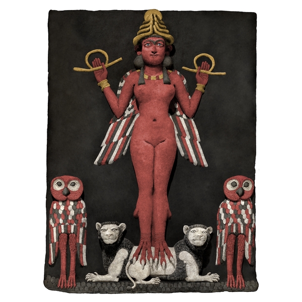 바빌로니아의 이슈타르 부조는 기원전 1800-1750여년 경에 만들어진 것으로서, 원래는 여신은 붉은 색으로, 바탕은 검은 색으로 칠해져 있었다. 구운 강화점토로 만들어진 이 부조는 이슈타르가 특히 밤의 세계를 지배하는 여신임을 강조하고 있다. 그래서 이슈타르의 날개는 양 옆에 서 있는 올빼미의 날개와 같은 모양을 하고 있으며, 그녀의 발 역시 새의 발 모양이다. 생식과 다산을 주관하는 여신으로서 그녀는 관능적인 나체의 몸매를 드러내고 있다.\r\n