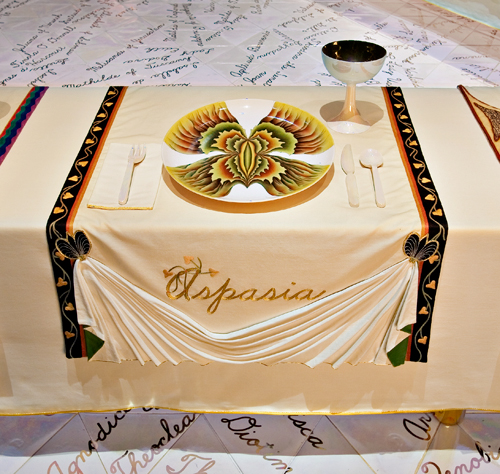 <디너 파티>는 삼각형으로 배치된 대형 테이블에 39인용 식기 세트가 배열되어 있는 믹스드 미디어 설치작품이다. 저녁식사에 초대된 인물들은 고대부터 근대까지 서구문명에 등장하는 신화와 역사속의 여성들이다. 도자 접시는 여성기를 상징하는 나비와 꽃모양이 그려져 있거나, 오브제로 놓여있다. 시카고는 이제까지 평가절하 되어온 자수와 도예라는 여성의 미술 분야를 통해, 잊혀진 여성의 역사를 말하고자 한다. 아스파시아의 자리는 특히 고대 그리스 예술의 요소들을 많이 차용하여 표현된다. 이로써 그녀는 그리스 문화의 주요한 인물로서 강조된다. 흙으로 빚은 도자 접시에 아스파시아를 상징하는 커다란 꽃이 그려져 있고, 그 옆에 도자 물잔과 포크, 숟가락, 나이프가 놓여 있다. 커다란 식탁 천에는 그리스의 대표적인 문양인 종려나무 잎사귀가 정교하게 수놓아져 있다. 전면에 아스파시아라는 이름 아래는 그리스의 가장 기본적인 의복인 키튼 모양의 주름으로 이뤄져 있다. 특히 \'A\'에서 싹이 트고 잎사귀가 자라는 것으로 표현하여 아스파시아가 당시 고대 철학자들과 정치인들에게 미쳤던 영향을 강조하고 있다.