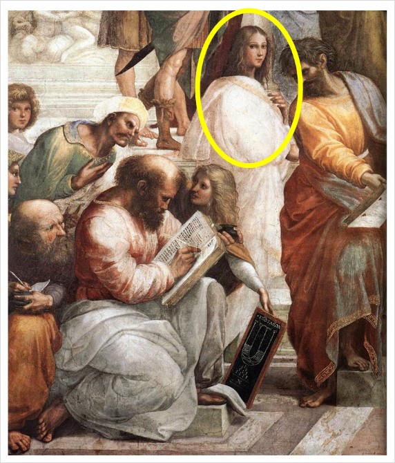 <아테네 학당>은 르네상스의 화가 라파엘로가 그린 700 Ⅹ 500cm의 프레스코화이다. 이 벽화는 로마바티칸 궁내 교황이 개인 서재로 사용하였던 ‘서명의 방’에 있다. 이 방에는 철학, 신학, 법, 예술을 주제로 한 네 개의 프레스코화가 그려졌으며, 1511년에 완성된 <아테네 학당>은 철학을 대표한다. 이 그림에는 고대 철학을 대표하는 여러 남성 철학자들이 등장한다. 그리고 이들은 각자 자신의 학문적 특징을 드러내며 그려져 있다. 예를 들어 중앙에 플라톤은 자신의 저서를 든 채, 손가락으로 하늘을 가리키며 관념세계를 논하는 그의 철학을 암시하고, 반대로 아리스토텔레스는 손바닥을 땅바닥을 향해 펼쳐, 자연세계에 대한 탐구를 대변한다. 그러나 유일한 여성철학자인 히파티아는 어느 누구와도 얘기하지 않고 사람들 속에 묻혀 혼자 서있다. 눈을 크게 부릅뜨고 정면을 응시하며 하얀 가운을 왼손으로 잡고 전신을 가린 채 매우 방어적인 동작을 취하고 있다. 순결함을 드러내는 하얀 가운은 독선적 종교와 정치에 의해 비극적으로 희생된 순교자의 형상화이고, 다른 한편으로는 남성들에 의해 이루어진 학문계에서 외로운 이방인인 여성의 모습을 표현한 것이다.
