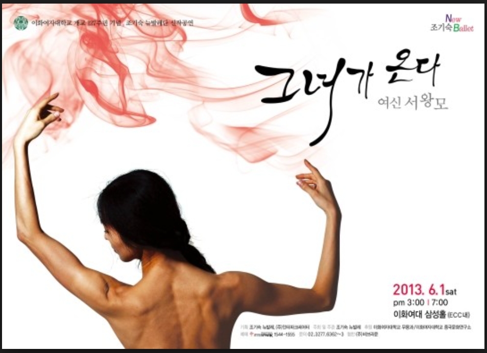 <그녀가 온다-여신 서왕모>는 원형콘텐츠를 현대적인 감각으로 재해석한 창작 발레 공연이다. 공연은 총 3막으로 구성된다. 동양의 최고 여신 서왕모와 달, 태양, 산, 꽃과 풀, 구름과 비, 대지 등을 상징하는 여신 6명이 각각 등장한다. 무용은 서왕모와 유일한 발레리노인 목천자가 주축을 이룬다. 세상을 구하는 것은 아름다움과 사랑이라는 주제를 서왕모와 목천자의 사랑을 통하여 표현하고 있고, 신녀들은 영혼을 치유하는 구원의 전령사로 등장한다. 자연을 상징하는 6명의 여신은 항아, 여와, 산귀, 무라, 무산신녀, 희화 등 중국 신화에 등장하는 여신들이다. 공연의 구성은 각 여신들이 자신의 스토리에 맞게 한 바탕 춤을 춘 다음에 그녀들을 지배하는 서왕모의 등장을 환영하는 이야기가 펼쳐진다. 서왕모 역을 맡은 주역 발레리나인 조정희와 목천자 역의 발레리노 정운식의 춤과 연기는 애절한 사랑을 잘 표현한다. 중국 신화의 신비로움을 살리기 위해 무술의 남녀고수 네 명을 등장시키고, 신화의 판타지적 요소는 디지털 영상을 배경으로 활용하여 화려하고 다양한 무대를 제공한다. 동양의 신화를 서양의 발레로 새롭게 창작한 <그녀가 온다-여신 서왕모>는 한류열풍을 타고 중국에 K-Ballet 열풍을 일으킬 여신시리즈 첫 번째로 제작된 공연이다.
