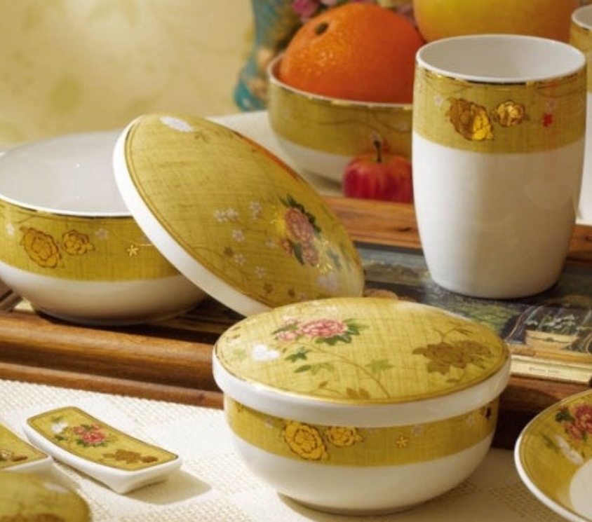 <조비연 칠첩반상기>는 전통 한복 의상의 질감에 우리나라 민화를 그려 넣어 고풍스러우면서도 세련된 모습을 연출한 반상기이다. 칠첩반상기는 밥그릇과 국그릇 이외에 7가지 반찬을 담을 수 있는 그릇으로 구성된 식기 세트로 예로부터 실속을 고려한 혼수 예단으로 많이 사용되었다. 사발과 대접, 찬기와 탕기 그리고 종지 등 25개로 구성된 <조비연 반상기>는 전한 시대 성제의 황후였던 비연의 이미지를 차용하여 중국 황실을 상징하는 황금색 바탕에 섬세한 꽃문양을 매치해 중후함과 고급스러움을 표현한다.