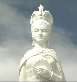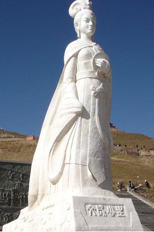 <문성공주> 조각상은 흰빛의 석재로 만든 10여 미터 규모의 거대한 입상 조형물이다. 조각상은 왕족의 장신구를 한 기품 있는 모습을 하고 있지만, 여행복장을 하고 있는 것으로 보아 장안에서 라싸로 가는 여정 중임을 표현한다. 오른손으로 옷자락을 자연스럽게 잡고 있으며, 왼손은 거울을 잡고 시선은 멀리 산 아래로 향해 있다. 조각상은 문성공주의 이동경로였던 청해성(青海省) 일월산 중턱에 위치해 있다. 중국과 티베트의의 경계 선상에 있는 청해는 역사적으로 두 나라의 분쟁이 잦은 곳이어서 문성공주 동상은 두 국가 간의 화합을 위한 상징적 의미를 담고 있다. 문성공주의 헌신적 면모는 이곳의 평화를 수호하는 조각상에 잘 표현되어 있다.