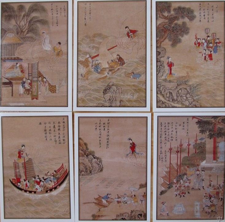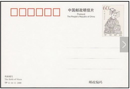 <마조전설>은 중국의 대표적 여신인 마조의 삶을 기리기 위해 발행된 우편엽서다. 엽서는 148x100mm 통상 규격 엽서로 전해 내려오는 마조 고사를 6매의 시리즈로 나누어 150만장 한정으로 제작된다. 각 장에는 마조의 탄생부터 죽은 이후 수호신이 되기까지의 과정이 마조탄생(6-1妈祖诞生), 해상구난(6-2海上救难), 미주비승(6-3湄洲飞升), 신녀호사(6-4神女护使), 전당조제(6-5钱塘助堤), 통천제사(6-6涌泉济师)를 제목으로 도안되어 있으며, 액면가는 6-6(1위안)을 제외하고 0.6위안(60分)으로 발매되었다. 엽서 <마조전설>은 마조의 이야기를 구체적으로 작은 화면에 담는다. 6매 중 5매의 엽서 그림에 마조가 등장하는데, 마조는 인간의 세계와 다른 비현실적인 세계에 위치한다. 신격화된 마조를 강조하기 위해 마조는 하늘과 구름 위에 있거나 인간 세상을 내려다보는 먼 곳에 배치되며, 행운을 가져다주는 붉은 색의 옷을 입고 있다. 엽서의 상단에는 그림의 내용을 말해주는 화제(畵題)가 있고, 전체 그림은 황색 계열의 바탕에 실사의 내용을 중심으로 마조를 상징하는 바다와 배가 등장한다. 엽서는 2000년 마조 탄생 1040주년을 기념하여 마조의 생일인 4월 27일에 발행된다.