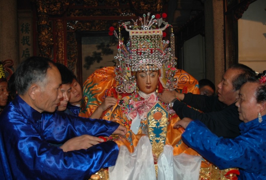 <마조축제(마주지디엔 媽祖祭典)>는 마조의 고향인 메이저우다우에서 마조의 탄신일인 음력 3월 23일과 승천일인 음력 9월 9일, 1년에 두 차례 거행된다. 경배 의식은 가족 제의와 사당 제의가 있다. 가족 제의의 경우에는 마조의 상(像)을 가정이나 배 안의 제단에 모시거나 가족의 평화와 안전한 항해를 기원하며 바다에 제물을 바친다. 사당에서 진행되는 제의는 꽃을 헌화하고, 폭죽을 터뜨리며 분향한다. 메이저우다우의 여성들은 머리를 배 모양으로 틀어 올리고, 전통의상인 푸른색 상의와 붉은 색 바지를 입고 마주에 대한 신앙심을 표현한다. 어려움에 처한 사람들은 반달 모양의 나무 ‘성배’를 이용해서 마주에게 도움을 청한다. 자녀가 없는 기혼 여성들은 마주에게 잉태를 빌며 마주 상에 꽃을 헌화한다. 어부들은 바다신에 대한 경외감을 보여주기 위해 마조의 탄신일 즈음에는 출항을 하지 않는다.