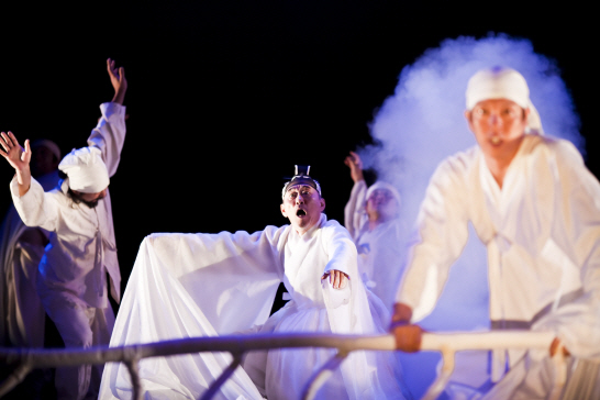2011년 예술의 전당에서 초연한 <템페스트>는 셰익스피어의 <템페스트>를 원전으로 하여 <삼국유사>의 <가락국기>를 접목시켜 한국적인 무대를 만들어낸 공연이다. 오태석이 각색하고 연출한 연극 <템페스트>는 원전의 배경이 되는 밀라노를 <삼국유사>의 가락국으로 설정하여 유쾌한 판타지가 있는 한국적인 희곡으로 재창조한다. 어린 딸과 함께 쫓겨나는 프로스페로는 가락국의 도사 질지왕으로 공국을 빼앗기 위해 프로스페로를 쫓아내는 알론조는 자비왕으로 변용된다. 셰익스피어의 <템페스트>가 용서와 화해라는 진지하고 무거운 주제를 담고 있는데 반해 오태석의 <템페스트>는 친근함과 코믹성이 가미된 유쾌한 놀이판의 이야기로 풀어낸다. 오태석은 여러 차례 굿판을 끌어들여 한국적 흥을 돋운다. 자비왕은 세자가 폭풍우에 휩쓸려 죽은 것으로 여기고 세자의 영혼을 위한 삼신제왕 굿을 펼친다. 극 중반부에는 자비왕 일당을 벌하는 필열지옥의 굿이 펼쳐진다. 굿은 배우들의 소리와 창, 춤 등 전통적이고 제의적인 요소들을 무대화하는 장치로 기능한다. 대북과 바라 장단은 태풍을 만나 흔들리는 배 위에서 죽음과 삶의 기로에 놓인 배우들의 역동적인 모습을 표현한다. 아지와 세자가 노래하듯 주고받는 3.4조, 4.4조 대사들은 극 전체에 흥겨운 리듬감을 제공한다. 배우들은 한국의 전통적인 의상을 입고 전통적인 창법을 구사한다. 뿐만 아니라 탈춤의 춤사위나 백중놀이, 만담, 씻김굿 등의 전통연희가 더해져 한국적인 무대를 연출한다. 아지는 사랑을 통해 화해를 이끌어내는 순수한 여성으로 그려진다.