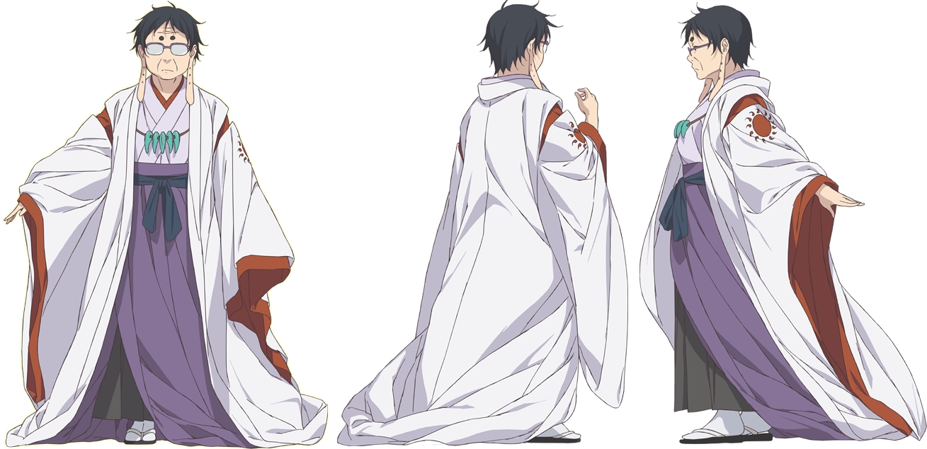 신화인물이 2014년 TV 방영된 애니메이션으로 변용되며 여러 형식적 변화가 나타난다. 동명의 원작 만화를 바탕으로 10편 짜리로 제작된 애니메이션에서 아마테라스는 비중이 크지 않지만, 세계를 총괄하는 지배자로서 존재감이 강하다. 또한 코믹함과 카리스마가 공존하는 의외의 면을 지닌 인물로, 실제로 그녀의 목소리를 연기한 베테랑 성우 이소베 마사코는 남성적이고 낮은 톤의 목소리로 나른함과 호통을 실감나게 연기한다. 여중생의 이색적인 우정과 성장을 다루는 애니메이션은 일본 신화를 각색한 판타지와 학원물을 한 데 섞은 작품이다. 주인공 이나리와 친구들과의 관계가 순수하고 귀엽게 묘사되며, 명랑한 분위기가 지배적이다. 여기서 아마테라스는 등장만으로 분위기를 전환시키며 독특한 신의 이미지를 그려낸다. 전반적으로 소녀적인 이미지가 강조되는 작화 방식이지만 그 중 아마테라스는 현실적인 모습으로 그려진다. 안경을 낀 모습에, 주름진 얼굴엔 귀가 부처처럼 길게 그려져 있다. 또한 곳곳에 유적지로 가득한 도시 교토를 배경으로 삼아 신사를 비롯한 고풍스러운 풍광이 아름답고도 서정적으로 묘사된다.