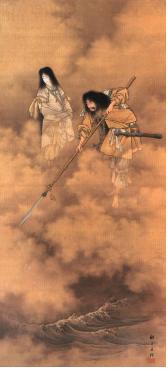 회화의 이자나미는 원형콘텐츠와 유사하게 일본 열도를 만드는 신으로, 생명의 근원이 되는 여성의 면모가 강조된 변용이다. 원형콘텐츠에서 천국과 지구가 탄생한 이후 주신 이자나기와 이자나미는 천신들로부터 떠돌고 있던 일본의 대지를 완성하라는 명을 받는다. 이 회화는 이자나기와 이자나미가 현재 일본 열도에 해당하는 섬들을 창조하는 ‘쿠니우미(国産み)’의 임무를 수행하는 서사를 바탕으로 하고 있다. 회화의 이자나미와 이자나기는 보석과 옥구슬로 장식된 창인 ‘아메노누보코(天之瓊矛)’를 쥐고 바다를 찾아내고 있다. 이자나기와 이자나미는 ‘하늘의 부교(天浮橋:あめのうきはし)’에 서서 아메노부호코로 혼돈에 있던 대지와 바다를 휘젓고 섞어 올리자 창으로부터 소금 등 뚝뚝 떨어진 것들이 쌓여 ‘오모고로지마(淤能碁呂島, 저절로 굳어서 된 섬)’이 된다. 원형콘텐츠의 이자나미는 일본의 창조신인 동시에 죽음과 저승을 관장하는 신이기도 하지만, 이 회화에서는 저승과 관련된 모티프는 생략되어 있다. 회화의 이자나미는 여성스러운 모습이 부각되며 나라와 생명을 창조하는 여신이다. 또한 그녀는 일본 역사에서 천황가의 모신으로서 신격화된 여신이다.