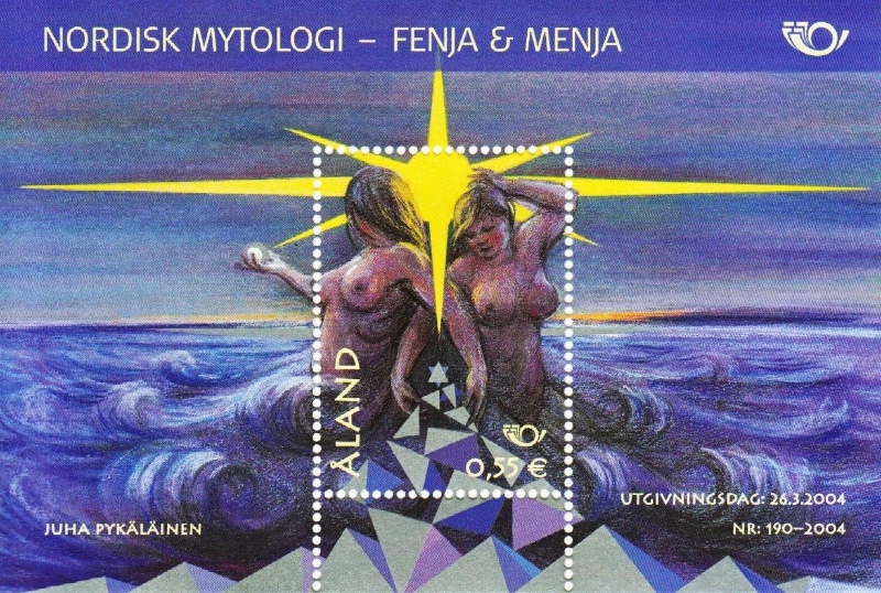 페냐와 메냐는 우표 <페냐와 메냐>에서 생명의 근원이 되는 여성의 이미지가 강조되어 나타난다. 원형콘텐츠에서 페냐와 메냐는 원하는 것은 무엇이든 만들어내는 마법의 맷돌 그로티를 돌리는 두 여성이다. 마법의 맷돌 그로티는 인간의 욕심으로 인해 그 소유주가 바뀌는 와중에 끊임없이 소금을 만들어내다 바다 속으로 가라앉는다. 페냐와 메냐는 바다 속에 가라앉은 맷돌을 지금도 돌리고 있다고 전해지는데, 바닷물이 짠 이유가 바로 이 때문이라고 한다. 바다의 소금이 생명의 원천임을 생각할 때, 페냐와 메냐는 생명의 근원이 되는 여성이라 할 수 있다. 우표는 이들을 주인공으로 하여 발행된 것이다. 우표는 바다 위에 서로의 등을 기대고 나체로 앉아있는 페냐와 메냐를 묘사하고 있다. 이들은 태양 아래 마치 맷돌을 돌리듯이 서로의 한쪽 손을 교차시키고 있다. 한 쪽 손에는 동그랗고 하얀 소금이 들려 있고, 페냐와 메냐의 두 손 아래로는 소금을 상징하는 결정체들이 흘러나오고 있다.