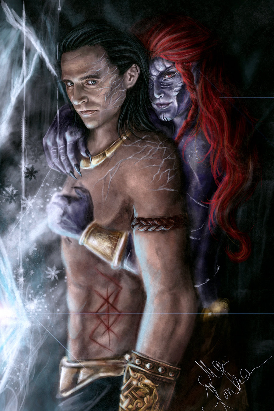 앙그르보다는 일러스트 <로키와 앙그르보다> 에서 불의 신 로키를 유혹하는 팜 파탈의 모습이 강조되어 표현된다. 원형콘텐츠인 북유럽 신화에서 앙그르보다는 로키의 정부로 등장하며, 로키와의 사이에서 세 명의 괴물자식을 낳는 거인 여인이다. \'앙그르보다\'라는 이름은 \'두려움을 만드는 여인\'이라는 뜻인데, 일러스트에서도 앙그르보다는 공포를 자아내는 모습으로 그려져 있다. 여기에 더해 일러스트는 자신의 정부인 로키를 유혹하는 앙그르보다의 모습을 강조한다. 빨간 색의 머리를 길게 늘어뜨린 채 로키의 가슴을 뒤에서 안고 있는 앙그르보다의 모습은 유혹적이면서 섬뜩하다. 옷을 걸치지 않은 상반신을 밀착시키며 로키와 함께 같은 곳을 함께 바라보고 있는 앙그르보다의 얼굴 표정은 붉은 눈동자를 통해 더욱 강렬하게 드러난다. <로키와 앙그르보다>는 로키를 유혹하여 그와의 사이에서 낳게 되는 자식들을 통해 신들과 벌일 최후의 전쟁을 준비하는 앙그르보다의 거칠고 강한 모습을 그린다.