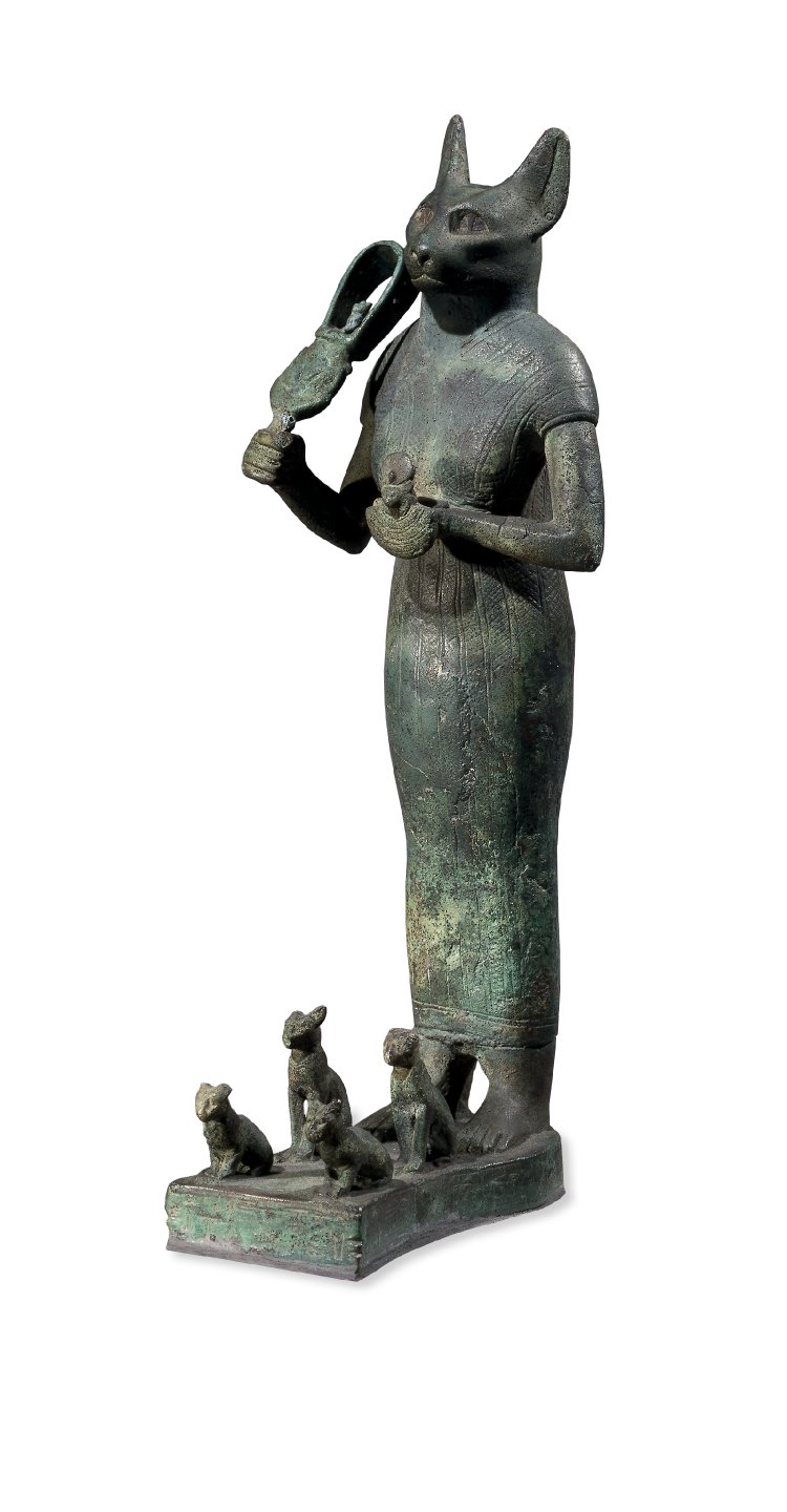 고대 이집트 미술은 대상을 표현할 때 세부적인 표현보다는 대상의 본질적인 부분에 집중한다. 그래서 일반적으로 얼굴을 제외한 나머지 부분의 묘사는 과감하게 생략된다. 이 작품에서도 바스테트는 얼굴 모습이 강조되어 형상화되어 있다. 하지만 청동으로 조각된 <고양이 여신 바스테트 상>은 바스테트를 온전한 형태로 묘사하고 있다. 이것은 바스테트가 가지고 있는 속성 중에서 모성애적 특성을 강조하기 위한 것으로 해석된다. 인간의 모습에 고양이 얼굴을 하고 있는 바스테트는 자기 새끼들을 이끌고 어딘가로 가고 있는 듯한 모습이다. 여기에서 바스테트가 가지고 있는 폭력적인 모습은 사라진다. 대신 여기서는 모성애와 함께 다산의 상징으로 표현되는 바스테트의 모습이 그려진다.
