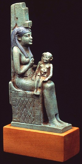 <이시스와 호루스>는 매우 희귀하게도 도자기로 만들어진 동상이다. 이는 예전에 이시스 신전에 봉헌된 성물이었기에 원형콘텐츠 이시스 여신의 특성인 지도자적 측면과 모성적 측면이 강조되어 형상화되었다. 청록색의 푸른빛이 감도는 매끄러운 표면으로 미니멀하게 표현된 여신 이시스는 부드러움과 온화함을 갖춘 어머니상을 나타낸다. 이시스의 무릎에 수동적인 자세로 앉아있는 호루스는 아직 몸을 가눌 수 없는 젖먹이 아기의 모습을 띠고 있어 여신의 모성을 더 강조하고 있다. 그녀의 풍만한 가슴은 동시에 풍요의 신으로서의 면모도 상징한다. 또한 머리위에 얹혀 있는 왕좌의 형상과 그녀가 쓰고 있는 보랏빛 가발은 왕권의 권위와 능력을 나타낸 조형적 표현이다.