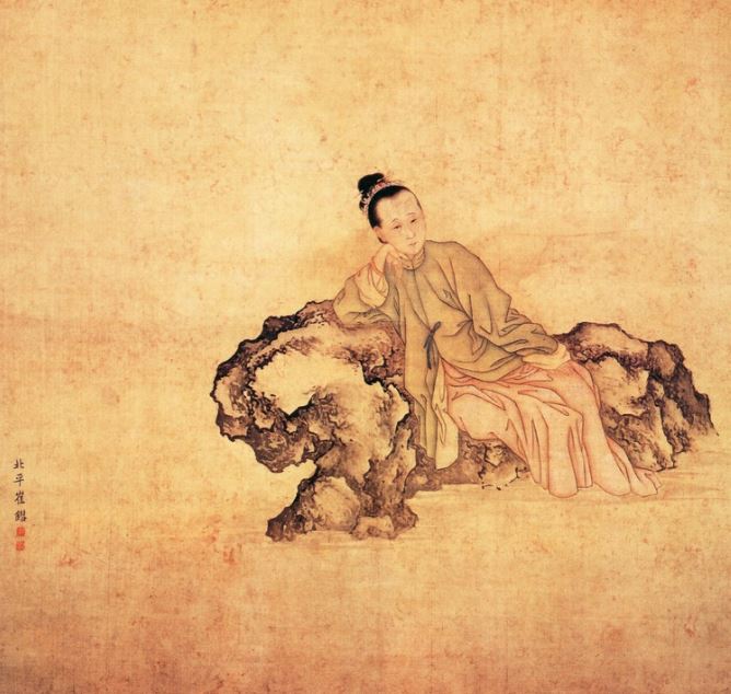 그림은 청나라 시대 화가 최척이 그린 이청조의 초상화이다. 이 초상화는 실크 바탕에 채색을 입힌 세로 56.7cm, 가로 56.8cm 크기의 그림이다. 그림은 중심부에 큰 바위와 이청조를 배치하고 나머지는 배경 없이 빈 공간으로 남아 있다. 화가는 이청조의 말년의 상황을 사실적으로 표현하기 위해 소재를 간결하게 처리하고 여백의 미를 적극 활용한다. 큰 여백이 상징하는 적막함, 깨끗함은 홀로 바위에 기대앉은 이청조의 자세와 고독한 표정, 장식품이 없는 옷차림, 소박한 외모와 조화를 이룬다. 바위와 옷 선의 굵은 붓 터치와 반대로 무언가를 응시하고 있는 듯한 표정 없는 얼굴의 세밀한 표현은 이청조의 감정상태를 효과적으로 보여준다. 압축과 생략의 미를 살린 이 그림은 화가의 작품 중에 명작으로 꼽힌다.