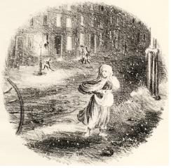 일러스트는 19세기경 제작된 <성냥팔이 소녀>의 석판화로, 1873년 Riverside Press에서 출판된 안데르센 동화집에 삽입된 것이다. 석판화는 석판 위에 크레용이나 유성잉크를 사용하여 도안을 그린 후 전체에 물을 칠해 물과 기름의 반발력으로 도안을 찍어내는 원리이다. 푸트넘의 일러스트에서는 특히 바람에 휘날리거나 길에 쌓인 눈이 눈에 띄는데, 이는 물을 사용하는 석판화의 특징적인 기법을 반영한다. 성냥팔이 소녀의 얼굴과 발은 창백하게 처리되어 불안한 심리를 그대로 드러낸다. 작품 후경에는 검게 처리된 건물과 거리와 대비적으로 빛나는 가로등이 있는데, 이는 모두가 가족과 명절저녁을 보내기 위해 집에 가고 텅 빈 거리를 비추며 슬픈 분위기를 더하는 역할을 하며 성냥팔이 소녀의 불운한 상황을 표현한다.