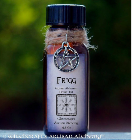 주술 용품 오일인 <프리그>에서 프리그는 왕비의 이미지를 이용한 상표로 변용된다. 프리그의 몇몇 기질이 강조 되는데, 조용한 힘, 고귀함, 절제된 감정과 집중이 그것이다. 소비자는 <프리그> 오일을 통해 그러한 감정적인 균형을 찾을 수 있다는 것이다. 이 제품에서 프리그는 제품을 구성하는 성분과 향을 통해 구현된다. 이 제품은 월장석과 자작나무, 식용으로도 쓰이는 허브 타임(Thyme) 등 천연 유기농 재료로 만들어지며 바닐라 향이 첨가된다. 또한 출산과 결혼의 여신인 북유럽 신화 원형처럼 프리그의 이름을 딴 본 제품 역시 출산 관련 의식에 효력이 있다고 한다. 이 제품은 미국의 회사 위치크래프트 아티잔 알캐미는 북유럽 샤머니즘과 룬 마술(북구의 룬 문자를 사용하여 신의 힘을 소환 및 행사하는 다양한 마술)을 위해 쓰인다. 또한 집중과 감정 제어에 효과가 있으며 물을 이용한 마술에 사용된다.