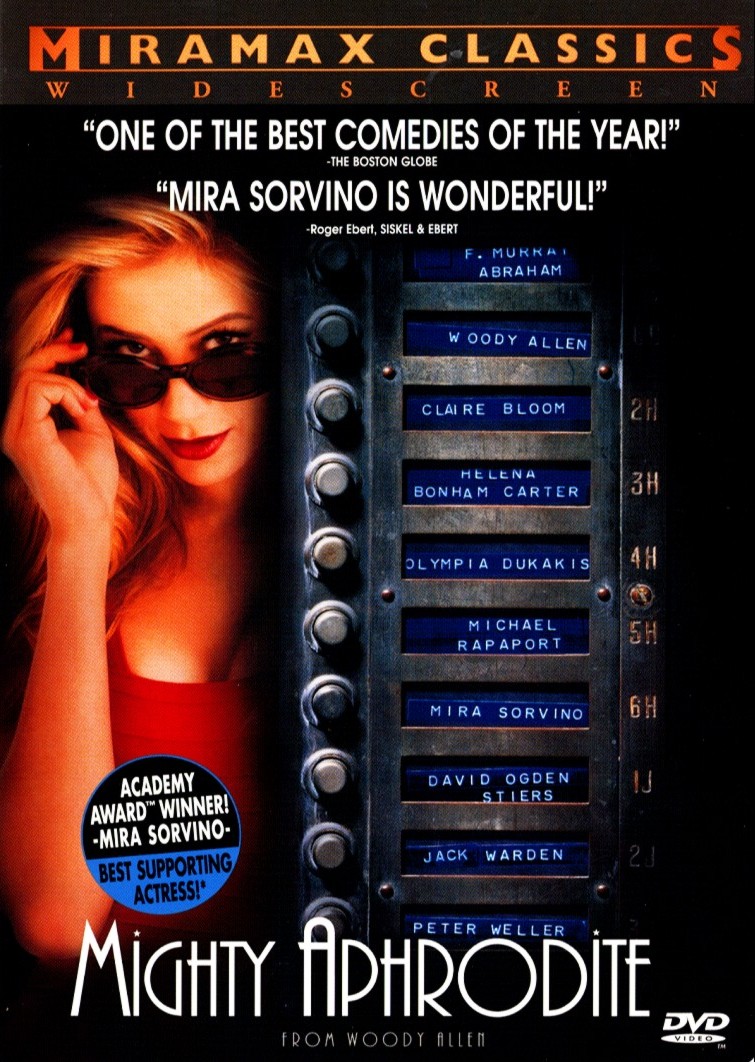 아프로디테는 우디 알렌의 영화 <마이티 아프로디테>에서 자신의 아이를 입양시킨 관능적이지만 순수한 여성 린다로 변용된다. 뉴욕의 스포츠 기자인 레니와 화랑 큐레이터인 아만다는 철저히 자기 생활을 즐기는 전형적인 여피족 부부다. 결혼한 지 꽤 된 이 부부는 왠지 시들해진 부부관계의 위기를 해결하기 위해 한 사내아이를 입양한다. 레니는 처음에는 입양에 대해 시큰둥하지만 막상 입양해온 아이(맥스)를 보고 점차 애정을 쏟는다. 입양 이후에도 부부 관계가 계속 서먹해지자 레니는 갑자기 입양아의 친엄마에 대한 호기심이 발동해 직접 아이의 친엄마를 찾아 나선다. 수소문 끝에 만난 생모는 린다(원형콘텐츠의 아프로디테)라고 불리는 포르노 배우에 창녀다. 하지만 레니는 자신의 양아들을 위해 그녀의 창녀생활을 청산시키고, 좋은 짝을 찾아주려 노력하면서 갖가지 해프닝을 벌인다. 이 과정에서 레니는 아내 아만다와 파경의 위기를 겪기도 하지만 결국은 서로가 자신들이 찾는 진정한 사랑임을 깨닫고 가정으로 돌아가며, 린다는 현재 그대로의 자신을 받아 줄 수 있는 남자를 만나 행복한 가정을 갖는다. 영화에서 린다는 창녀에 포르노 배우로 등장하지만, 권태로운 삶을 살던 레니에게 린다는 상스럽고 천박하지만 순수하고 꾸밈이 없는 아름다운 여성으로 진정한 사랑이 누구인가를 깨닫게 해주는 계기를 마련해준다. 그런 의미에서 마이티 아프로디테는 린다이며 원형콘텐츠의 아프로디테처럼 사랑을 연결시켜주는 역할을 수행한다.