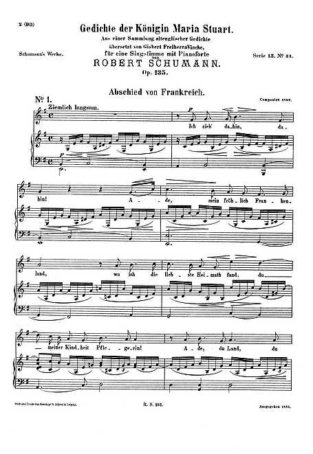 <메리 스튜어트 여왕의 시>는 메리 스튜어트가 직접 쓴 시의 독일어 번역가사에 슈만이 곡을 부친 슈만의 마지막 연가곡(Liederzyklus)이다. 다섯 편의 시를 통해 메리 스튜어트의 고난의 길이 시간 순으로 그려진다. 선율이 단순하며 전체가 단조(e단조 – e단조 – a단조 – e단조 – e단조)로 느리고 무거운 느낌을 준다. 단순한 선율진행은 엘리자베트 여왕 시대의 노래 형식을 모방한 것이다. 이러한 압축된 곡 형식으로 인해 음악의 내적 단순성을 손상시키지 않으면서 가사 내용의 장엄함과 극적 효과를 연출해내기가 어려움에도 불구하고 단순함과 통일성을 통해 죽음을 선고받은 메리의 고난이 불변하다는 점이 비극적으로 잘 표현된다. 제 3편 <엘리자베트 여왕에게>만이 다른 조성을 사용하고 있으며 템포도 빠르고 격하게 진행된다. 이로써 두려움에 휩싸인 메리의 절박한 심정과 엘리자베트에게 도움을 호소하는 감정이 잘 표현된다. 하지만 가장 긴 곡은 제 4편 <세상과의 이별>로서 1, 2, 3, 5편보다 연주시간이 두 배나 된다. 처형 직전 파란만장했던 세상사와 이별하는 착잡한 심정이 잘 드러난다. 이러한 곡의 형식은 수난자요 희생자로서의 메리 스튜어트의 면모를 한층 강조해준다.\r\n\r\n관련자료: https://www.youtube.com/watch?v=wBnCV101DbA