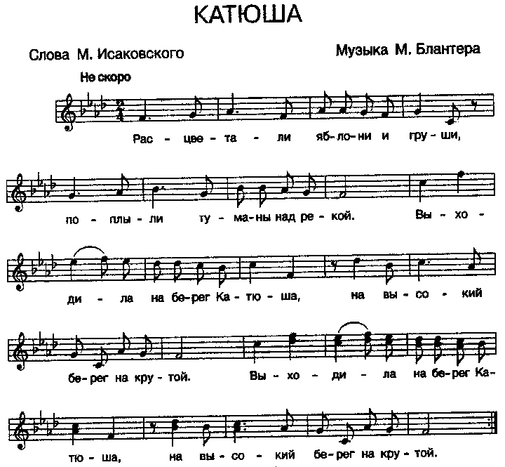 <카츄샤의 노래>는 1938년에 마트베이 아사코비치 블란테르가 작곡한 노래이다. 카츄샤는 톨스토이의 소설 <부활>의 여주인공 이름으로 노래의 제목은 여기에서 유래한다. 러시아 시인 미하엘 이사코프스키가 톨스토이의 소설 <부활>의 여주인공을 모티프로 한 시를 지었는데 이 시를 1938년 당시 모스크바 고리키 극장의 작곡가였던 마트베이 아사코비치 블란테르가 곡을 붙여 <카츄샤의 노래>라는 러시아 민요로 만들었다. 전장에 나간 애인의 무사함를 기원하는 <카츄샤의 노래>는 2차 세계대전 중 러시아 국민음악이 된다. 이 노래는 애국심 고취와 사기진작을 목적으로 군대에서 널리 불려진다. 노래의 애잔한 멜로디는 전장터로 나가 헤어진 젊은 연인들의 간절한 그리움을 전달한다. 노래의 첫 부분은 카츄샤가 전장터에 나간 헤어진 연인을 그리워하는 내용을 담고 있으며 노래의 끝부분은 카츄샤의 연인인 병사가 순수한 연인 카츄샤를 그리워하며 그녀가 살고 있는 조국을 지키겠다는 맹세를 담고 있다. 이 노래는 1979년 영화 <디어헌터>의 OST에 사용되면서 세계적으로 유명해진다. 노래의 가사는 다음과 같다. <사과꽃 배꽃이 피었지/강위로 안개가 피어오르고/카츄샤는 강 기슭으로 갔지/높고 험한 강 기슭으로(...) 그가 순수한 처녀를 기억하게 하라/처녀의 노래를 듣게 하라/조국의 땅을 지키게 하라/그리고 카츄샤의 사랑도 간직하게 하라>\r\n\r\n관련자료: https://www.youtube.com/watch?feature=player_embedded&v=eJL1S8WZtwE