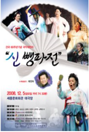 <신(新)뺑파전>은 익숙한 마당놀이 <뺑파전>을 대극장 무대에 올린 뮤지컬이다. 건국 60주년 기념 공연으로 기획된 뮤지컬은 마당놀이의 풍자적인 대사와 코믹한 몸짓을 현대적 장르에 맞게 새롭게 각색했다. 특히 신세대 관객을 위한 비보이 춤과 대중적인 트로트 가수가 부른 가요가 한 데 어우러진 젊고 풍성한 뮤지컬이다. 극의 시작은 굿판을 다니던 뺑파와 젊은 황봉사가 이별하는 장면이다. 극의 내용은 심봉사의 만남, 황봉사의 재회, 황성맹인잔치가 축을 이루고, 중심 내용이 아닌 것은 다양한 장르의 공연으로 구성되어 관객에게 많은 볼거리를 제공한다. 심청이 인당수에 빠지는 장면은 신영희의 뱃노래로, 황봉사와 사랑 장면은 태진아의 트로트로, 화려한 맹인잔치는 비보이의 춤과 경기민요 공연으로 대신한다. <신뺑파전>은 판소리로 엮는 창극적 요소, 역동적인 춤과 노래가 돋보이는 뮤지컬적인 요소를 모두 갖고 있는 새로운 뮤지컬이다. \r\n \r\n관련자료: http://tvpot.daum.net/v/4MVy3pzho1Y%24