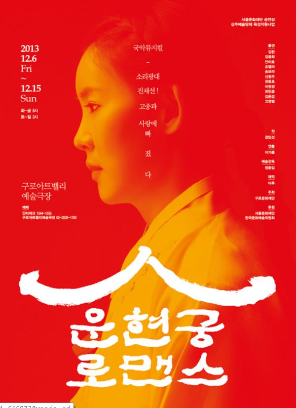 뮤지컬 <운현궁 로맨스>는 고종과 진채선의 사랑 이야기를 다룬다. 뮤지컬은 실존 인물인 진채선의 사랑 이야기를 허구적으로 형상화한다. <운현궁 로맨스>는 판소리 창법과 현대 음악으로 구성된 창작 뮤지컬로서 판소리부터 퓨전 국악, 힙합까지 다양한 장르의 음악이 사용된다. 전통 판소리 <춘향가>의 ‘사랑가’, ‘쑥대머리’, ‘이별가’ 등의 대목을 사용하기도 하지만, ‘꼭꼭 숨어라, 머리카락 보일라~’처럼 한국인에게 친숙한 멜로디를 이용하여 전통과 현대가 어우러진 무대를 펼친다. 뮤지컬의 구성은 <춘향가>의 인물과 상황을 차용한다. 채선과 고종의 아픈 사랑을 춘향과 몽룡의 사랑으로, 사랑을 방해하는 흥선대원군을 변사또와 연결시킨다. 이러한 삼각관계의 설정으로 진부한 멜로드라마가 되고 있지만, 원형콘텐츠의 색다른 변용이라는 점은 주목할 만하다. 역동적인 무대 구성은 뮤지컬의 극적인 요소를 더하는 부분이다. 운현궁의 실물과 흡사한 세트, 옆이 열리면 나타나는 새로운 방들, 수많은 등불들이 켜지는 연등회 장면 등은 역동적이고 다채로운 무대를 연출한다.\r\n\r\n관련자료: \r\nhttp://channel.pandora.tv/channel/video.ptv?ch_userid=etv_752&prgid=47645599