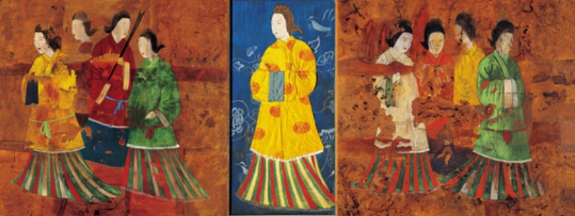 “역사 속의 종이부인”전에 소개된 <유화부인>은 90×179cm 크기로 큰 조형물(469x182cm) 안에 있는 일부분이다. 이 작품은 주재료인 한지에 전통채색기법으로 색을 내고, 그 위에 비단, 삼베 등 전통 옷감을 오려붙여 입체적 효과를 살린다. 유화부인의 강인한 성격은 한지와 모시에 천연 안료와 염료를 사용해 깊고 은은한 색을 통해 표현된다. 한지의 은은함은 유화부인의 온화한 성격을 담아내고, 한지의 부드러우면서도 질긴 속성에는 끈질긴 생명력이 담겨있다. 비단으로 만든 겉옷을 야무지게 여미고 손을 한 데 모은 모습에서는 빈틈을 보이지 않으려는 단호함이 엿보인다. 고구려 벽화를 재현한 신화 속의 여성들에서 튀어나와 홀로 선명하게 서있는 유화부인의 모습은 위풍당당하다.