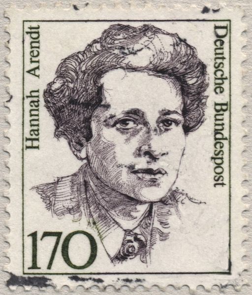 한나 아렌트는 서독 연방우편국에서 발행한 우표에서 별다른 인물변용 없이 주체적이고 실천적인 여성으로 표현된다. 그녀의 흑백 초상은 중년의 한나 아렌트를 나타내고 있다. 특유의 예리한 눈빛과 훤칠한 이마, 큼직한 코와 두툼한 입술은 아렌트의 강인한 의지와 탁월한 지성을 강조한다. 다른 한편으론 불안과 수심의 표정이 드리워져 있다. 예민한 정신성의 상징인 눈가 그늘은 젊은 시절부터 그녀의 모든 사진들에서 드러나는 특징이다. \r\n이 우표는 독일역사에서 유명한 여성인물들을 기념하고자 한다. 그러나 정작 한나 아렌트는 나치정권의 탄압을 피해 망명지를 전전하다가 1950년에 미국귀화시민이 된 이후 자신을 미국인으로 인식했다. 그녀의 학문적 깊이와 정치사회이론의 중요성을 인정해 그녀를 독일여성으로 기리고자 하는 독일 인들의 소망과 한나 아렌트의 현실적 자기 정체성간에는 분명한 간극이 놓여있음을 볼 수 있다.