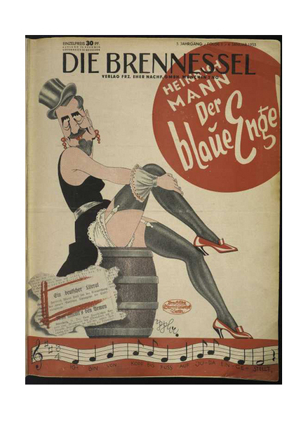 주간지의 표지그림에서 롤라롤라는 캐리커처라는 매체를 통해 이미지의 왜곡과 과장에 의한 변용이 이뤄진다. 영화적 변용 <푸른 천사>의 롤라롤라의 포스터에 원작자 하인리히 만의 머리를 몽타주하였다. 그럼으로써 롤라롤라는 몸만 롤라이고 머리는 하인리히 만인 그로테스크하고 익살스런 모습으로 풍자된다. 하인리히 만의 얼굴은 초점없이 음흉해 보이는 눈빛과 표정, 그리고 빨간 입술을 칠하고 귀걸이를 단 모습으로 마치 성도착자 같은 느낌을 준다. 만의 사회주의적 성향과 사회비판적 작품은 나치의 표적이었다. 나치의 집권이후 영화 <푸른 천사>를 포함한 만의 전 작품은 금서조치를 받는다. 외관의 표현 뿐 아니라, 이 그림의 하단에는 유명한 롤라의 노래악보를 그려 넣고, 그 아래 작은 글씨로 “난 머리에서 발끝까지 유다에 맞춰져 있어요.”라는 구절이 같이 인쇄되어 있다. 이 구절은 영화 <푸른 천사>에서 롤라롤라가 불러 커다란 인기를 끌었던 「난 머리에서 발끝까지 사랑에 맞춰져 있어요. Ich bin von Kopf bis Fuß auf Liebe eingestellt」 라는 노래의 패러디로서 “난 머리에서 발끝까지 유대족속(유다)에 맞춰져 있어요 Ich bin von Kopf bis Fuß auf Juda eingestellt” 라는 문구를 첨가한다. 이를 통해 롤라롤라는 독일의 소위 “건실한” 시민들을 퇴폐적으로 이끌어가는 사악한 유대인으로 변용된다. 또한 독일어 \"Juda\"는 유대족속 뿐 아니라, 예수를 배반한 제자 가롯 유다로 쓰일 수도 있기 때문에 작가 하인리히 만과 더불어 롤라롤라가 독일 민족을 배반하는 “유다”같은 인물이라는 비난을 담고 있다.