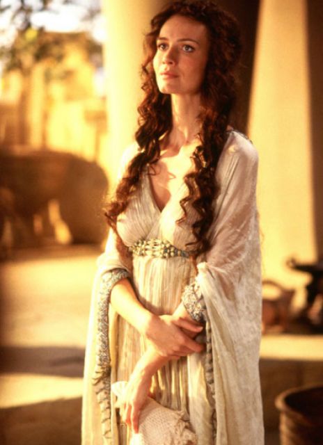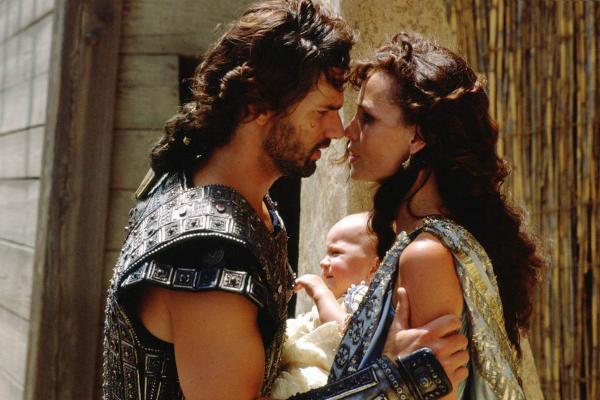 영화 <트로이>는 원형인물 안드로마케에 대한 재해석 및 변용을 크게 시도하지 않는다. 헥토르의 아내로서 잠깐씩 등장하는 안드로마케는 전쟁 중 여러 차례 죽음의 위협을 받는 남편 헥토르의 출전을 눈물로서 만류하고자 하나, 결국은 순종하는 모습을 보인다. 이를 나타내기 위해 그녀가 등장하는 장면에서는 어둡고 슬픈 빛이 주조를 이르는 장면들이 대부분이다. 특히 헥토르가 그리스의 영웅 아킬레스와 최후의 결투를 앞두고 있을 때, 안드로마케와 헥토르의 이별장면이 매우 비장하고 애절하게 묘사된다. 이 컷에서는 헥토르와 안드로마케 그리고 그 사이에 아기를 미디엄 클로즈업으로 함께 비춰서, 아름다운 가정의 모습을 보여주고, 그 이후 가장의 죽음으로 인한 비극성을 극대화한다. 마지막 장면에서 트로이가 함락되자 비탄 속에서도 안드로마케는 아기를 품에 안고 살아남은 트로이 동포들을 이끌고 산을 넘는다. 이 장면은 남편 헥토르의 애국심에 대해 아내가 보이는 존경의 표현인 동시에 한 아이의 어머니로서 갖는 고귀한 모성애의 표현이다.