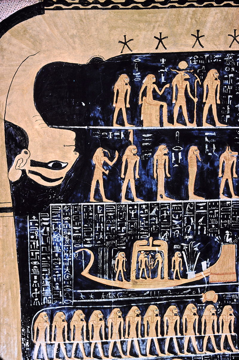 ‘밤’이라는 의미를 갖고 있는 누트는 고대 이집트인의 우주관에 등장하는 여섯 세계 중 천공을 관장하는 여신이다. 이집트인은 세상이 아침에는 케프리, 낮에는 라, 저녁에는 아툼이라고 불리는 태양신에 의해 천공, 창공, 대기, 대지, 물, 지하 세계의 여섯 세계로 구성되어 있다고 생각했다. 이 여섯 곳에는 모두 그곳을 관장하는 신들이 있는데, 그 중 천공, 즉 하늘을 다스리는 여신이 누트이다. 그 밖에 창공은 네네트, 대기는 슈, 대지는 게브, 물은 누, 지하세계는 다트가 다스리는데, 누트는 대지의 신인 게브와 관계를 가져 오시리스와 세트, 이시스 등 여러 명의 신들을 낳는다. 누트에 대한 가장 알려진 이야기는 게브와 관련된 이야기다. 누트는 태양신 라의 뜻을 어기고 몰래 게브와 사랑을 나눈다. 누트와 게브는 처음에는 겹쳐 있었으나 라가 대기의 신 슈를 시켜 누트의 복부를 떠받치게 함으로써 그녀의 배는 하늘이 되고, 게브는 땅이 되었다는 것이다. 이때부터 누트와 게브는 서로 떨어지게 되었는데, 화가 난 라는 활 모양으로 변해 손가락과 발가락으로 몸을 지탱하고 있는 누트의 복부에 별을 수놓아 그 복부가 원통 모양의 하늘을 이루도록 해 놓는다. 이후 라는 누트에게 1년에 한 달도 땅에 눕지 못하도록 하나, 누트를 가엾게 여긴 정의의 신 토트의 도움을 받아 5일 동안 게브를 만나 오시리스, 호루스, 세트, 이시스, 네프티스 등 다섯 자녀를 낳는다. 누트는 태양신 라의 딸인 까닭에 태양의 어머니로 불리기도 한다. 태양이 매일 동쪽에서 떠올라 서쪽으로 사라지는 것을 보고 사람들은 누트의 품에서 태양이 태어나는 것으로 생각했기 때문이다. 누트는 죽은 자들의 수호신으로 숭배되기도 한다. 그래서 누트는 보통 암소의 모습 혹은 머리 위에 둥근 단지를 인 사람의 모습으로 표현된다. 그밖에 누트는 발가락 끝으로 발돋움을 하고 서서 손가락 끝을 대지에 대고 있는 여성의 모습, 석관의 뚜껑 안쪽에서 죽은 자를 지켜보고 있는 우아한 여성의 모습 등 여러 형태로 나타난다.